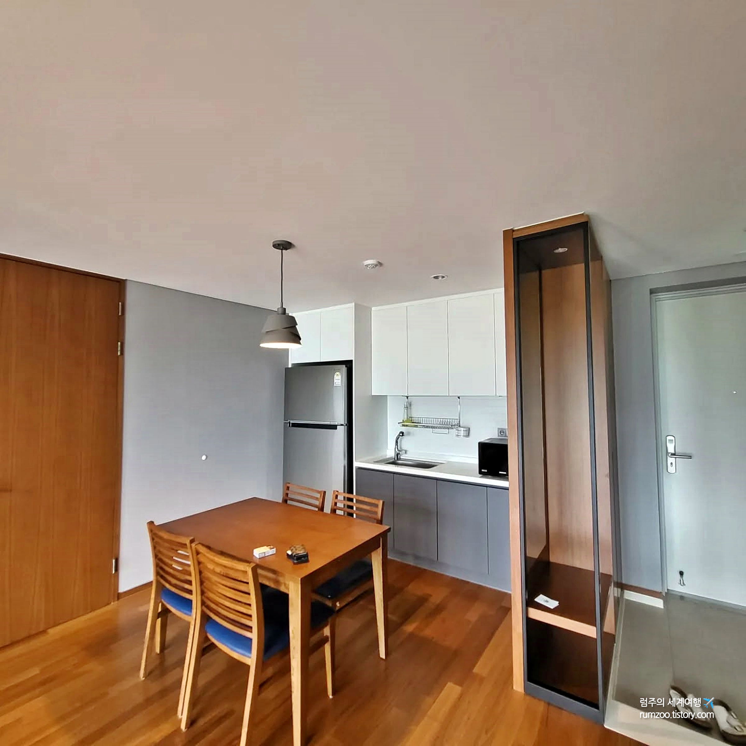 주의사항: 주방은 있으나 취사 금지입니다. 전자레인지, 전기포트, 간단한 식기류는 구비되어 있어 간편식 위주로 이용 가능합니다.