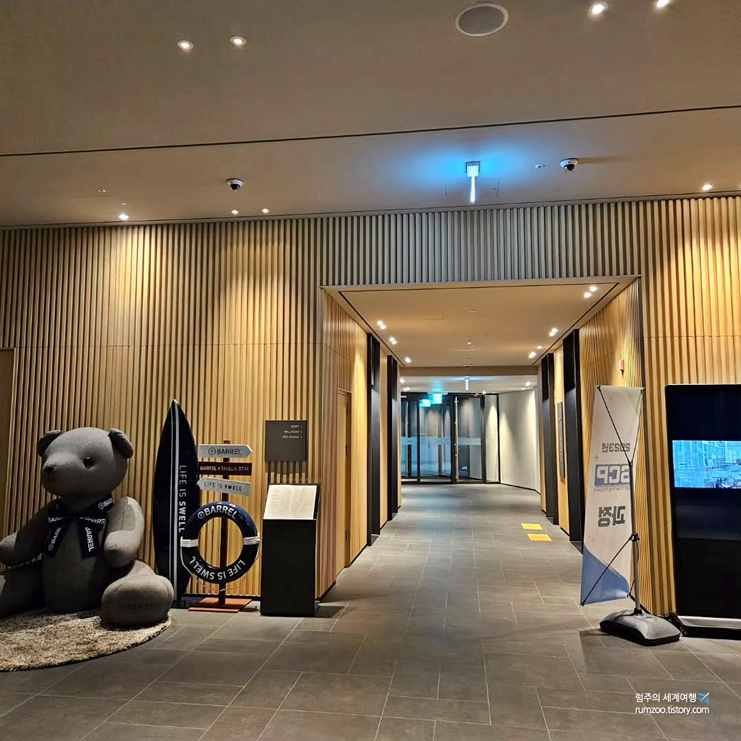 1층 로비에는 신라스테이 시그니처인 대형 곰 인형이 귀엽게 반겨주고, GS25 편의점도 함께 있어 간단한 간식이나 물건 구매하기 편했어요.