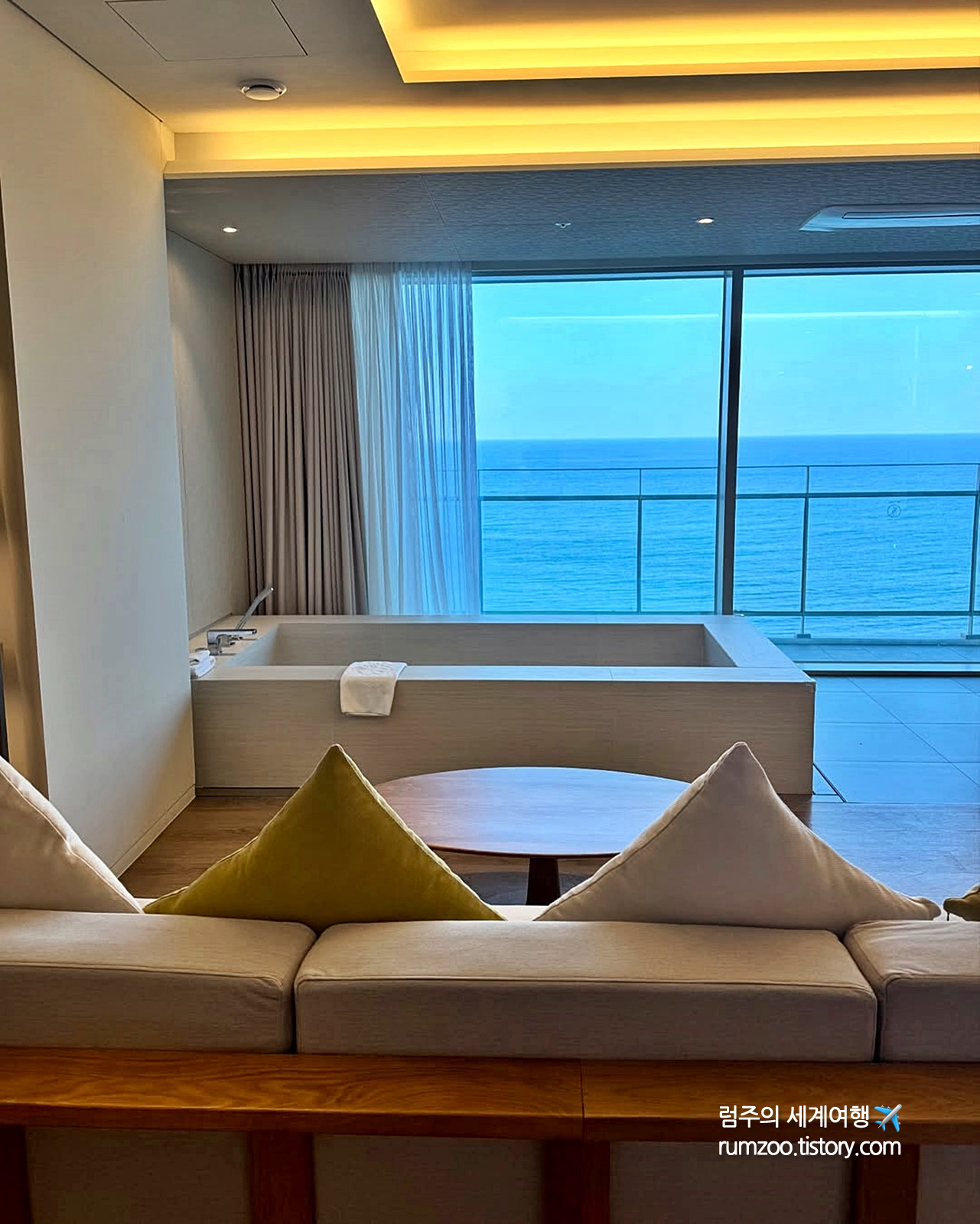 가장 좋았던 건 침대에서 바로 보이는 바다와 발코니 앞 대형 욕조! 목욕하면서 대포항 오션뷰를 감상하는 힐링의 시간은 정말 최고였어요.